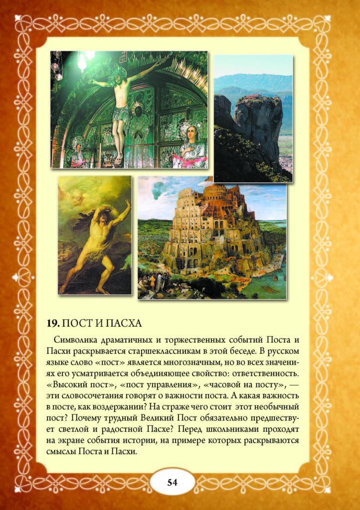 Символика драматичных и торжественных событий Поста и Пасхи раскрывается старшеклассникам в этой беседе. В русском языке слово «пост» является многозначным, но во всех значениях его усматривается объединяющее свойство: ответственность.»Высокий пост», «пост управления», «часовой на посту», — эти словосочетания говорят о важности поста. А какая важность в посте, как воздержании? На страже чего стоит этот необычный пост? Почему трудный Великий Пост обязательно предшествует светлой и радостной Пасхе? Перед школьниками проходят на экране события истории, на примере которых раскрываются смыслы Поста и Пасхи.